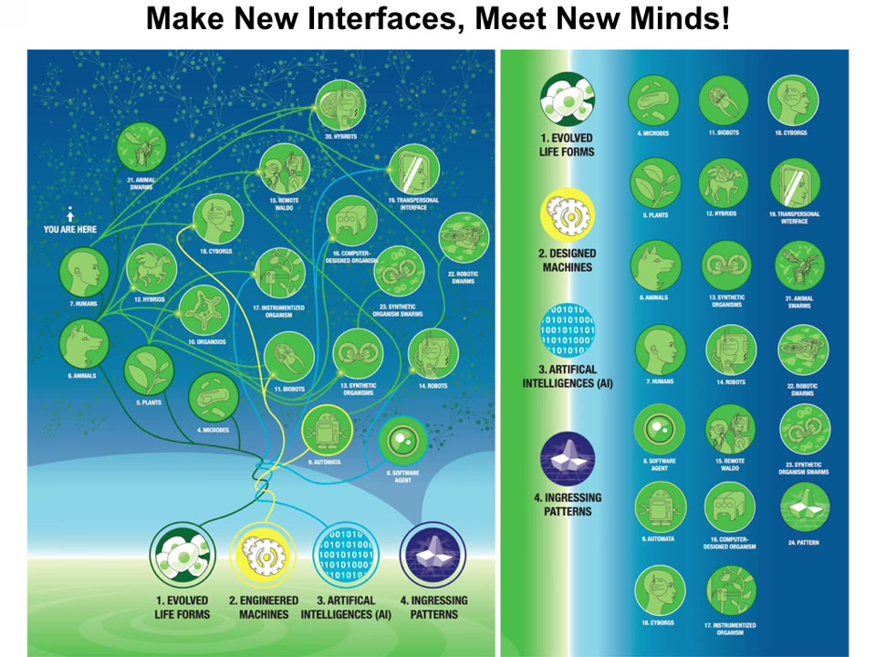 This means that if we continue to make these new interfaces, everything from various kinds of cyborgs and biobots and bioengineered objects and swarms, swarm robotics, and the Internet of Things, all these different things, we are going to end up pulling down behavioral propensities, meaning kinds of minds, from this Platonic space that we have never seen before. Perhaps ones that have never been embodied before anywhere on this planet, maybe nowhere in the universe. We are well underway to making all kinds of new interfaces for new kinds of minds. We have to be alert to that because we are not good at predicting them whatsoever.