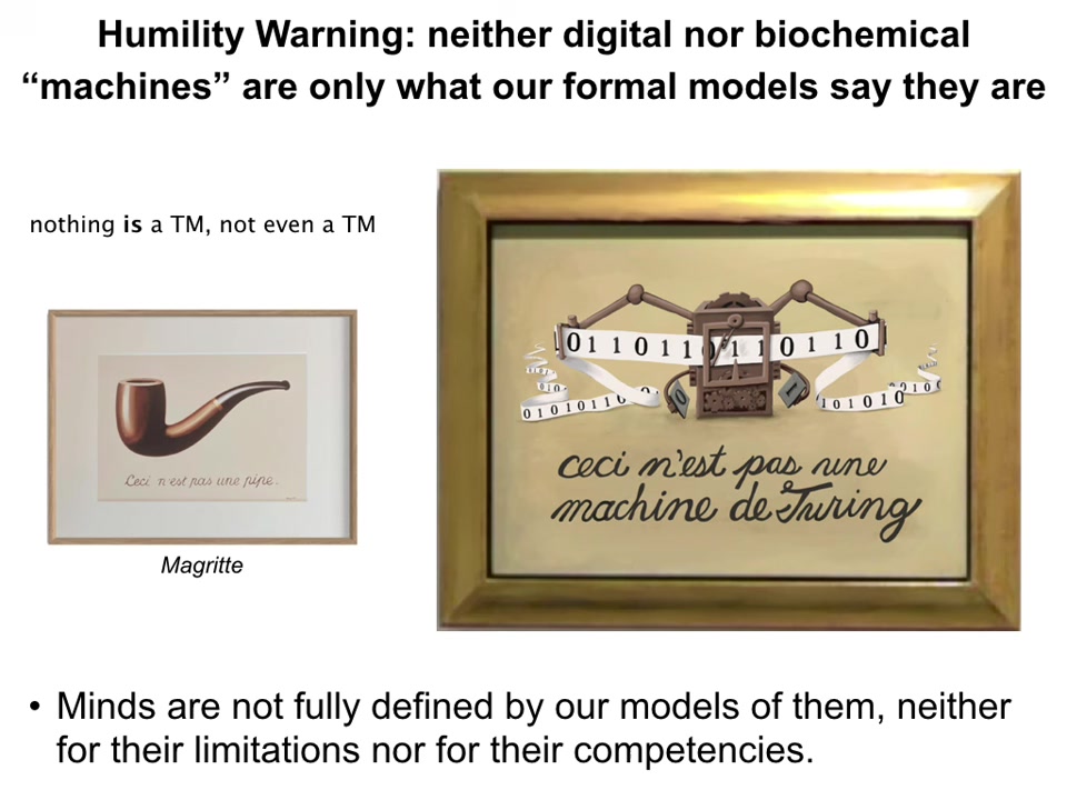 And this should not be controversial: this idea that our formal models are just that. They're formal models. They don't necessarily capture what anything is doing. Certainly not biology. I don't think Turing machines and algorithms are useful formal models for biology. I don't think they exhaustively tell the story of even what we call simple machines.