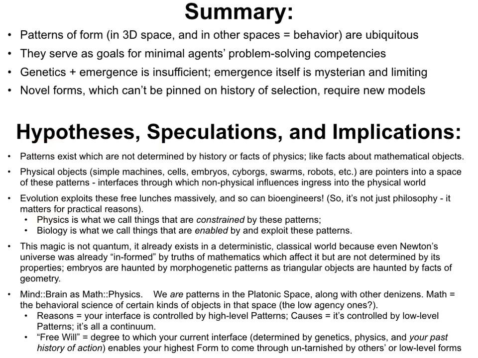 This talk is called "Patterns of Form and Behavior Beyond Emergence." This is my attempt to think about how patterns from the Platonic space inform evolved, engineered, and hybrid embodied minds. The paper describing all of this in more detail is here. It's a preprint that's going to be a chapter of a book, and you can download it here.