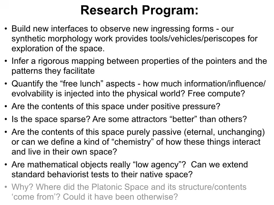 One thing that I suspect, but don't have any evidence for yet, is that the contents of the space is not purely passive. These are not eternal, unchanging forms, the way that some people have cast them, but actually dynamic, and that maybe we can actually define a kind of chemistry of what's happening to these forms. Can they interact with each other distinct from their interaction via the interfaces of the physical world? And is it really true? I've said several times that maybe mathematical objects are the low agency ones in that space, and then you have these minds and so on. I'm actually not sure of that at all. We have some ideas on extending standard behaviorist tests into the native space of mathematical objects to see if whether we've really misunderstood them all along and have not recognized what they're capable of. Stay tuned for that. We have some papers coming on this in the next few months.