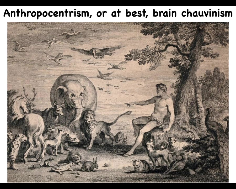 But the one thing that is interesting about this depiction is that, according to the old biblical story, it was on Adam to name the animals. God couldn't do it. The angels couldn't do it. It had to be Adam that names the animals. In these ancient traditions, naming something means that you've discovered its true inner nature. By discovering its name and giving it the right name, you've learned something profound about it. And that part is absolutely right about this. So we're going to try to get rid of this anthropocentrism and, in fact, brain chauvinism, but we are going to keep a part of this.