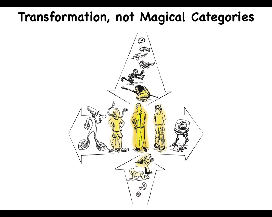 So the first thing is that we know now, from evolution and developmental biology, that this sort of standard modern adult human, which features so prominently in the stories of Philosophy 101, all of these things they talk about, humans do this and we do that. But actually, we know that we are at the center of several continua. These are continuous slow processes that got us from a single cell on an evolutionary scale or a developmental scale. And whatever you say about this human, as far as the ability to understand, the ability to have moral worth, to have responsibilities, to have credit and blame and all those sorts of things. Whatever this magical, a gentle glow that modern standard humans have, you would have to be able to tell a story of how it got here slowly and gradually from these continua.