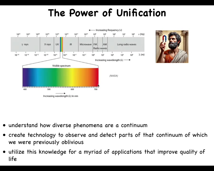 What I think is really interesting is an analogy to the electromagnetic spectrum. Back in the day, before we had a mature theory of electromagnetism, we had lightning, and we had static electricity, and we had light, and we had magnets and various other phenomena. We thought those were all different things. Not only did we think those were all different things, but we were only directly sensitive to an extremely narrow part of this whole spectrum. What happened? We acquired a good theory of electromagnetism, and that allowed us to do several things. It allowed us to understand that things that we think of as quite different are actually the same thing. They are different expressions of the same underlying dynamics. An incredibly powerful unification. Then it allowed us to build technologies and to realize that while we are directly only sensitive here, that's just a contingent fact of our evolutionary history. With tools, with the right equipment, we can become sensitive to all of this stuff. There are many applications. This is what I'm really interested in.