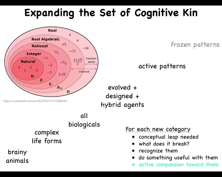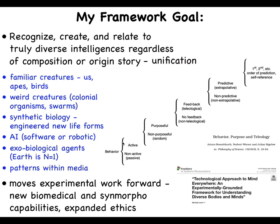 I'm interested in developing a framework where we can see how you get all the way from passive matter, and by the way, I'm no longer sure there is any such thing, and all the way up to human level and beyond of metacognitive kinds of minds. These are the things I want to understand together as being on the same spectrum, not just mammals and birds, but all kinds of weird organisms, including things that are not even themselves physical, such as patterns within media.