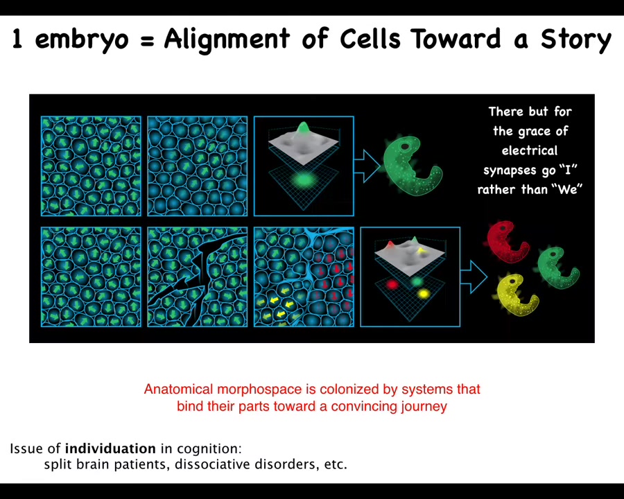 This has many implications in cognitive science. One of the things that my lab has driven is the development of this parallel between cognition and morphogenesis, between the formation of the body and the formation of the mind. They're the same problem. When you look at this kind of dissociation, there are many things that we learn here about split brain patients and dissociative identity disorders.