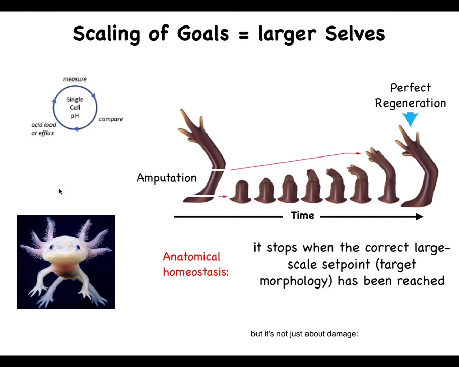 Here's an axolotl. These amphibians regenerate most of their body parts, including limbs, eyes, jaws, spinal cords. If you were to amputate anywhere along the plane of this limb, these cells would immediately sense that they've been taken away from their goal. They would work hard to rebuild, and when they get there, they would stop. How do they know when to stop? They stop when a correct salamander limb has been completed. They stop when they get back to their homeostatic state. No individual cell knows what a finger is or how many fingers you're supposed to have, but the collective absolutely does. It does a means-ends analysis here to get back to where it needs to be once you've deviated it. This whole thing is not just about damage. It's not about fixing this kind of surgical defect.
