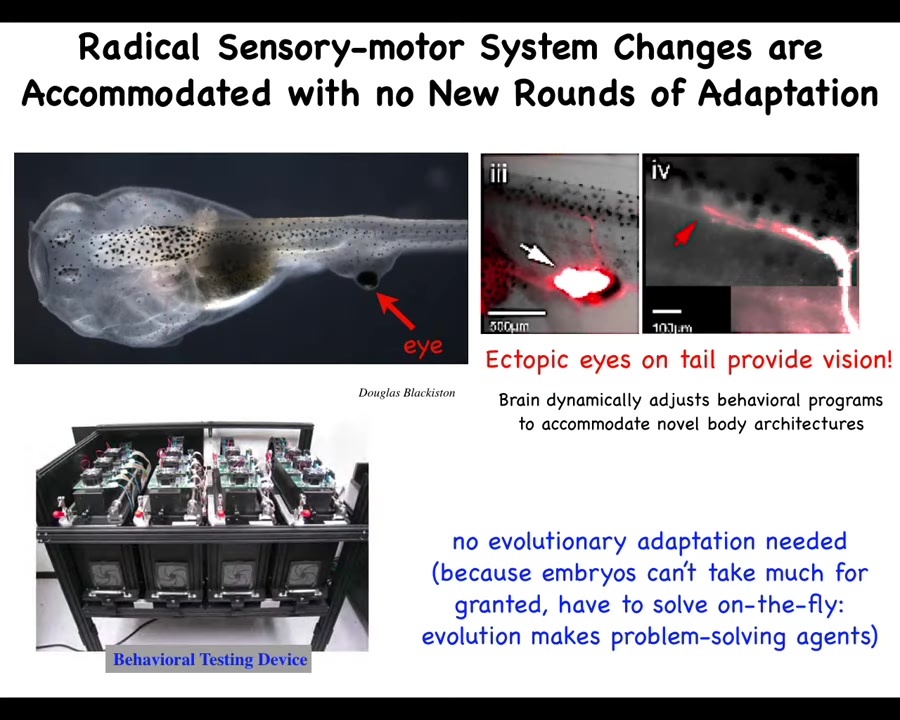 But what happens with this eye is that it makes an optic nerve. That optic nerve does not go to the brain. It synapses on the spinal cord or sometimes on the gut, sometimes nowhere at all. The most amazing thing about it is that these animals can see. We know because we built this device that trains them for visual learning tasks, and they can see perfectly well.
