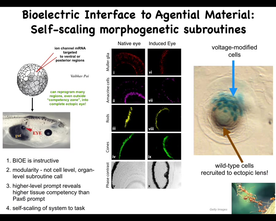 They can do another neat trick, which is that if you only inject a few of them, so the blue ones are the ones we injected, they will recruit their neighbors to make this lovely lens that's sitting out in the tail of a tadpole somewhere. We didn't have to touch these cells. All we said is, you guys should make an eye. They take it from there. They say, there's not enough of us. Let's get our friends to help. They convince. And it's a process of trying to infect them with a better world model of what they should be doing. There's a debate that goes on and the cells resist. But when they win, you get this beautiful eye. And of course, there are many other collective intelligences that scale to problem size on their own.