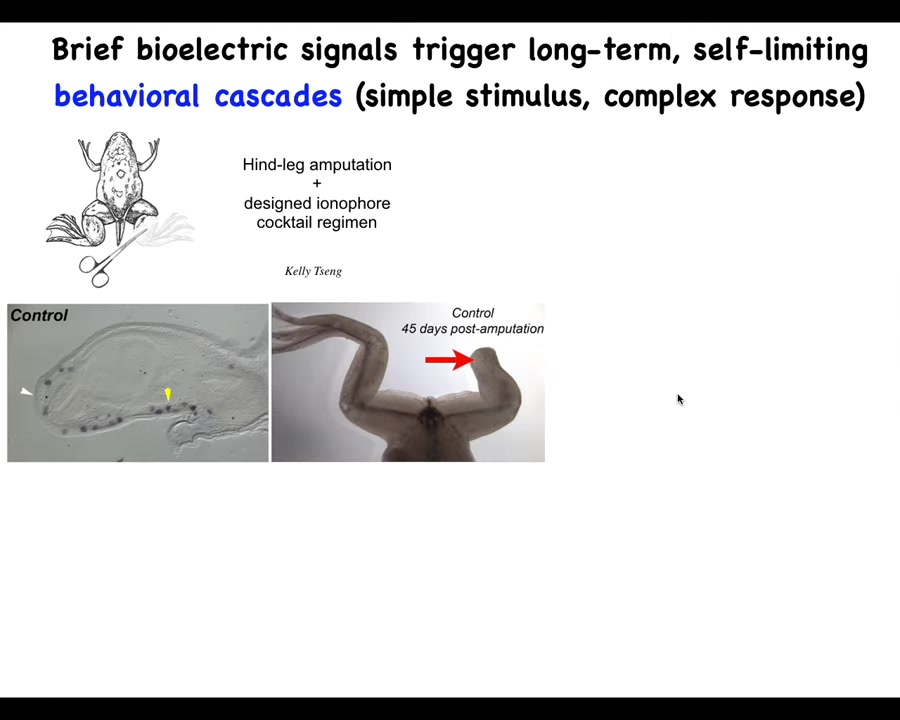 The most important thing here is that with any good cognitive system, you do not micromanage the molecules. When I'm talking to you, I'm not worried about reaching into your brain and having to arrange all the synapses so that you remember what I've said. I'm giving you information on a very thin communications channel, and I'm trusting you as a high-end cognitive system to do all the biochemistry downstream that's required for you to react to what I'm saying. The same thing is true here. This signal was present for 24 hours, and after that, we have shown a year and a half of leg growth, during which time we don't touch it at all. The goal is not to micromanage it. It is not to tell the cells what to do. It is not to 3D print scaffolds for stem cells, none of that. The goal is to convince it on day one that this is the path you should go. The leg building path is the right one, not the scarring path. There you go.