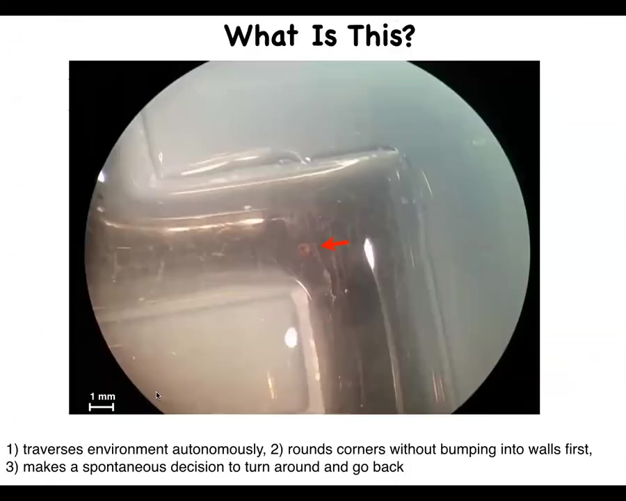 I want to start by asking what this is. This is a small biological that seems to traverse an aqueous path. This is filled with water. It moves down the path on its own. You'll see here it's completely self-driven. It moves down the path. It takes the corner without bumping into the opposite wall. Then spontaneously, it turns around and goes back where it came from. What is this?