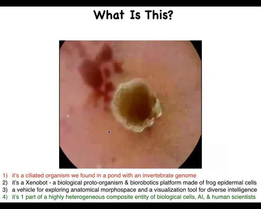 One thing you might think is that this is a ciliated organism that you might have found in a pond somewhere, and it would have an invertebrate genome. And that's definitely not correct. It's a Xenobot. This is a biological proto-organism and a bio-robotics platform that's made of frog epidermal cells. And this is true. It's also a vehicle for exploring anatomical morphospace and a visualization tool for diverse intelligence research. And I think that would be deeper and closer to the truth. Today I'm going to talk about another way of thinking about this, which is that it's just one part of a very heterogeneous composite entity, which consists of biological cells, artificial intelligence in a computer, and human scientists.