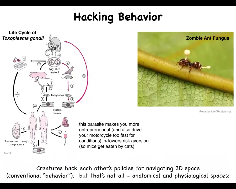 One of the things that we want to talk about is how organisms hack each other or control each other's behavior. You've probably all heard of this zombie ant fungus, which infects these ants and causes them to do a certain behavior, which is to crawl up on these leaves and freeze and later be eaten. There's another parasite which has this complex life cycle where it spends part of its time in certain animals, part of its time in other animals that eat the former animals. One of the things that this parasite does in order to make sure that the host gets eaten by the next one is that it reduces its risk aversion. If it finds itself in a rodent, for example, these rodents will lose fear of cats and they will come out in the open; they'll get eaten by the cat and the parasite goes there.