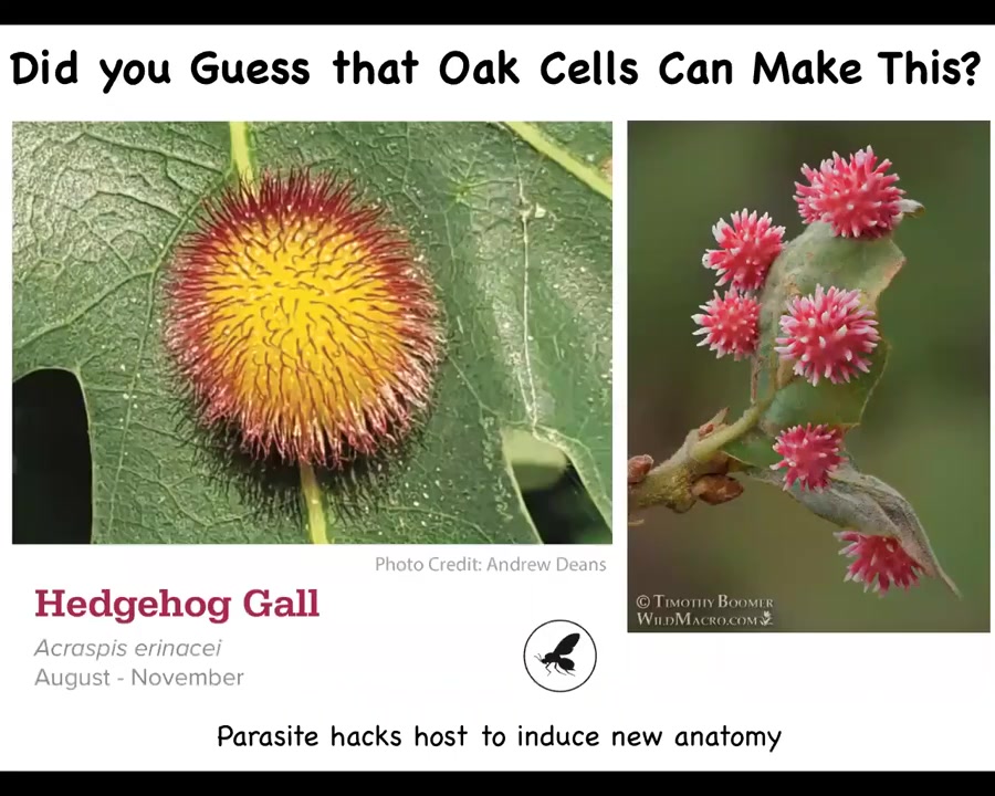 But what you might never guess is that it can make these structures. These structures, which are called galls, are made of the plant cells themselves. They are induced by a parasite, a particular wasp, hacking these plant cells, releasing certain signals that get these cells to build these unconventional structures.
