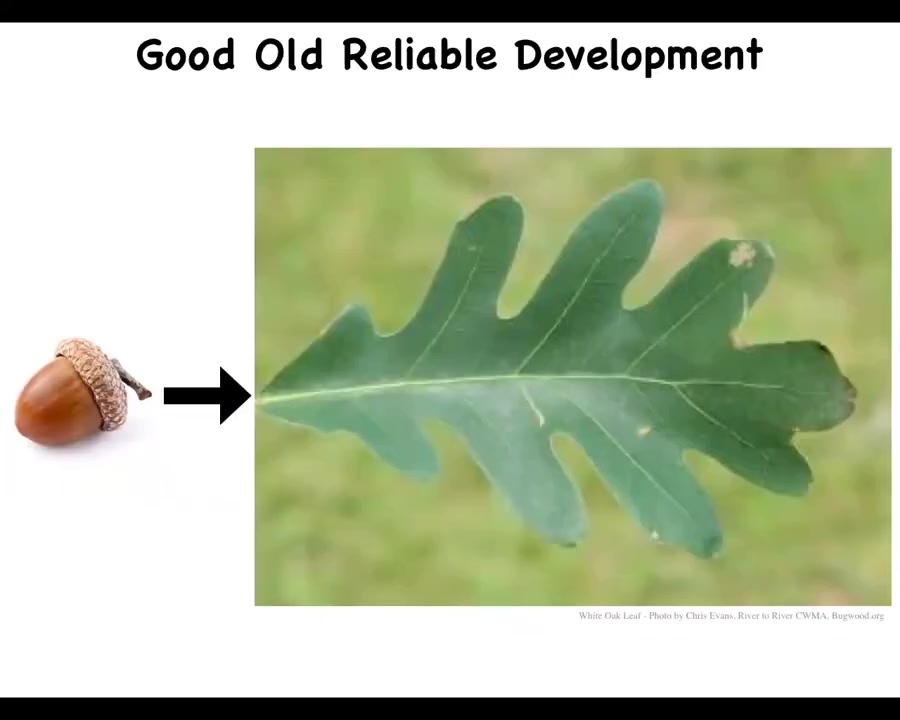 We are generally not drawn to these kinds of ideas because we think of development as reliable. Development is very reliable and robust. After all, acorns always give rise to oak trees, and we think that this sort of thing is what a genome does. The oak genome that comes from the acorn is able to make this nice flat green structure.