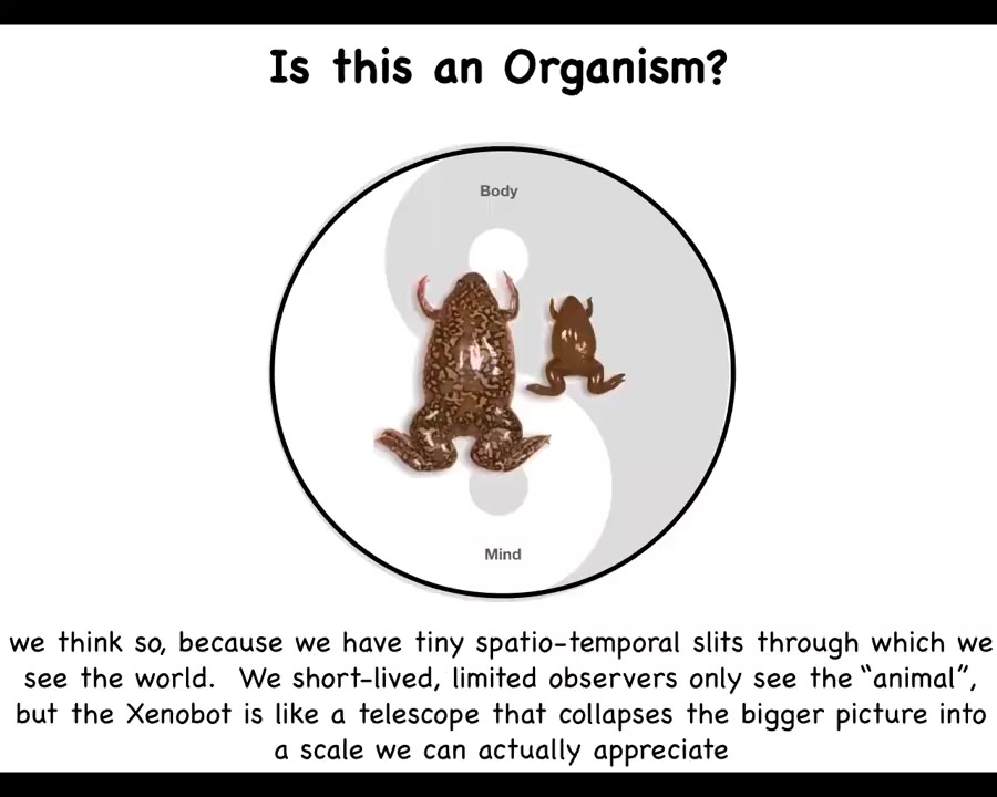 And so we can ask ourselves, as we look at this frog and it has a certain body and it has a certain cognitive structure with behavior. And so we say, okay, here is the organism. This frog is an organism. But I'm going to argue that we think this is an organism because we have really fairly tiny spatiotemporal portals through which we see the world. We don't see the whole evolutionary cycle. And I think that something like a Xenobot is an amazing device that collapses this much bigger picture into a scale that we can actually appreciate.