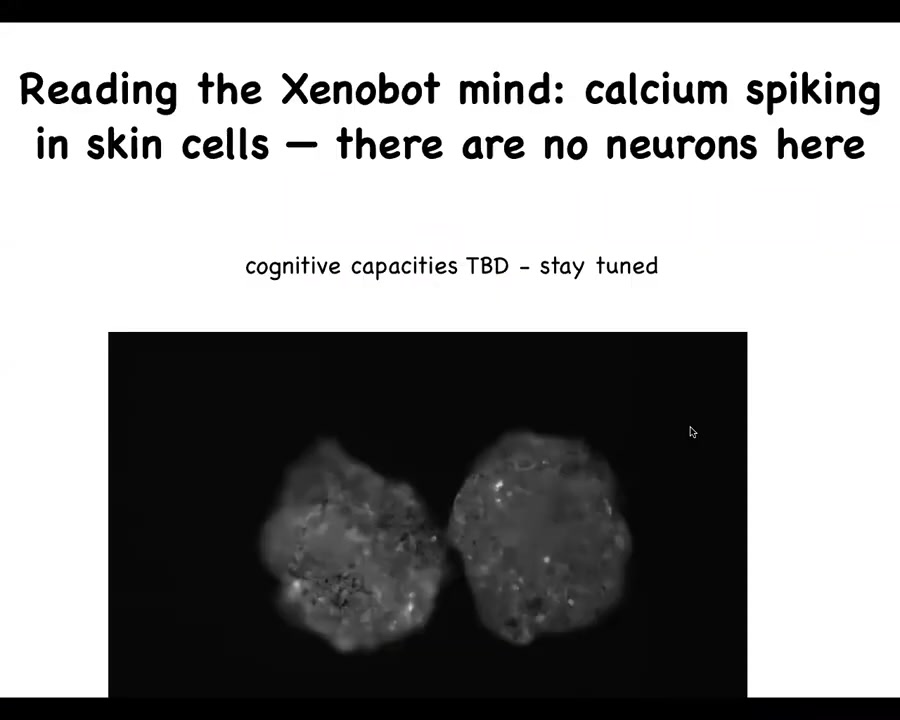 There's nothing there other than skin cells. In fact, if you do some calcium imaging, this is the same kind of imaging that one would do on a brain for looking at physiological signaling activity in brains. What you'll see in these Xenobots is something similar. You see lots of activity, and you can imagine all of the tools of information theory being applied to ask how much integration there is within the bot, how much communication might there be between bots, and so on. The cognitive capacities are being studied now, so I'm not going to talk much about that. Stay tuned for that. We have all kinds of experiments asking what can they learn, what do they sense, what are their preferences, all of that is to come.