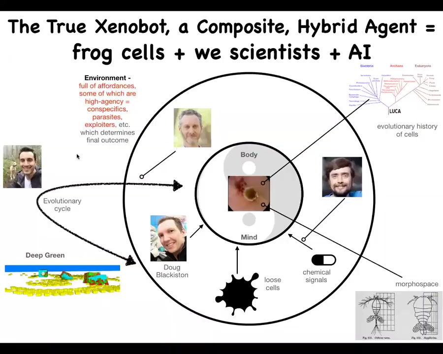 There's this composite entity of the AI that did the evolutionary simulations to figure out what the manipulations should be to get the cells to do this. The other features of the environment, particularly the four of us, are features of the Xenobots environment that are hacking it in exactly the same way that I showed you the other biology hacks.