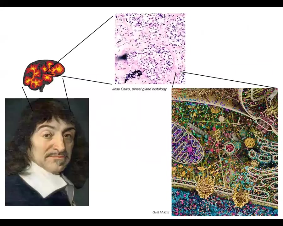 In fact, Rene Descartes was really interested in where in the brain one could attach this unified intelligence that we feel, the unified experience of humans. And he really liked the pineal gland because he said that there was only one of them in the brain. So that fit this idea that there should be one place where the unified cognition of the human resides. But if he had access to good microscopy, what he would have seen is that there isn't one of anything. Inside that pineal gland is this. So lots and lots of little cells. And inside each one of those cells is this stuff. Look at this amazing structure. All of this is what works together to result in the competencies of single cells and all of them together, for example in the brain, but also in the body, working together, result in emergent competencies and cognitive systems of higher types of creatures.
