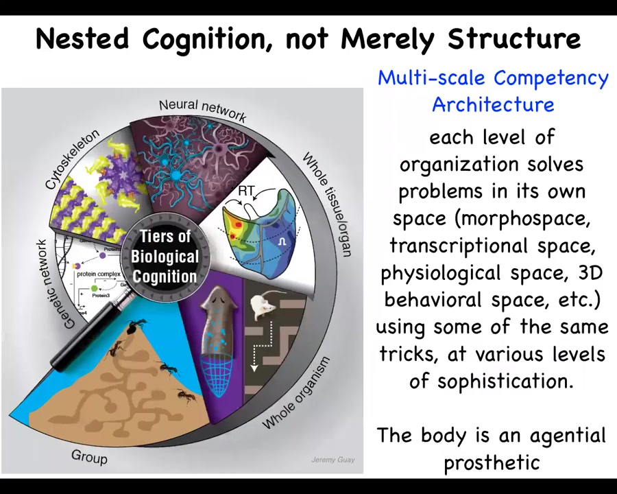 And so what we have in biology is this idea that we are not just structurally nested, that is, made of organs, tissues, cells, and molecular networks, but actually each of these layers is competent to solve various problems in its own space. So this is a multi-scale competency architecture. The molecular networks, the cellular networks, the organs, the whole bodies, and swarms all solve problems in various spaces: the space of morphogenesis, the transcriptional space, the physiological space, and then, in our case, linguistic and social spaces as well.
