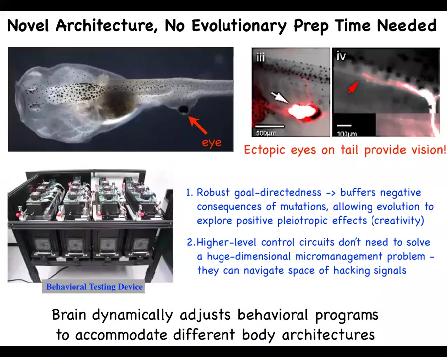 This has many interesting consequences. For example, this robust ability to deal with large-scale changes to the structure of the organism, the fact that these cells are perfectly happy to build an eye wherever, they will find some interesting place to connect to and so on, during evolution, this massively buffers the negative consequences of mutations. If your eye happens to be moved somewhere else, no problem, your fitness is not zero after that. You still have quite a degree of behavioral success. This allows evolution to explore positive pleiotropic effects of various mutations, in effect, a kind of creativity. And it also means that this kind of evolutionary process doesn't need to solve a huge dimensional micromanagement problem of how to direct every cell. What it actually could search and navigate is the space of hacking signals, signals that get various cells to do various things. And we think that that's a much more tractable space.