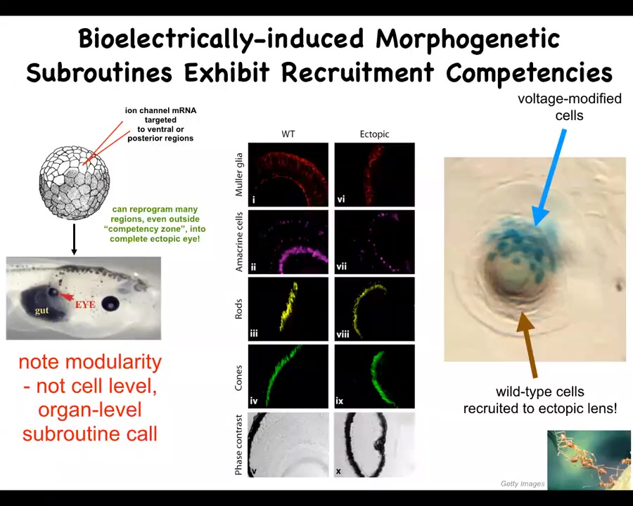 Now, in this case, what we've done is something quite different. We, in my group, study bioelectrical signaling. This is voltage-based signaling between all cells, not just neurons, but all cells exchange these electrical signals. One of the things we've learned is a kind of bioelectric subroutine call that says build an eye at this location. We can make many different organs. We can make brains and limbs and hearts and inner ear organs and so on. But I'm going to show you an example of an eye.