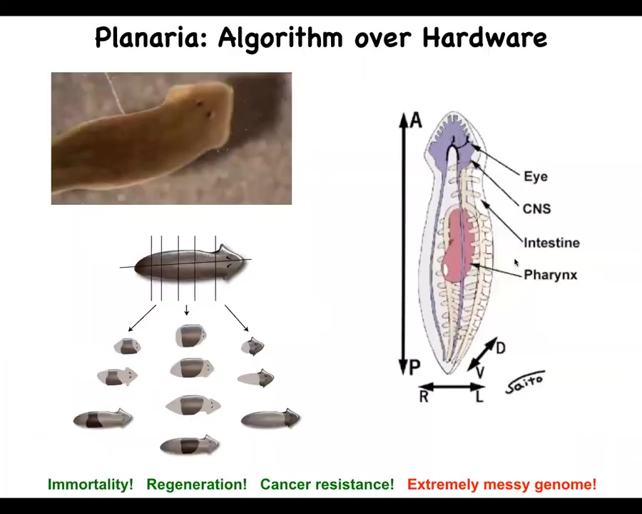 What happens in these guys is that they've basically perfected the algorithm that evolution isn't expecting the hardware to be robust. The hardware is assumed to be highly variable and faulty. Every cell in these guys can have a different number of chromosomes. They're mixoploid. So you really can't count on the hardware very much. What you have to have is an algorithm that builds a perfect worm no matter what's underneath. And that's why they're resistant to disorders of aging and cancer. In fact, of transgenesis: they don't even have transgenic planaria or lines of mutant worms. Those don't exist because these guys will build a perfect worm under a huge range of conditions.