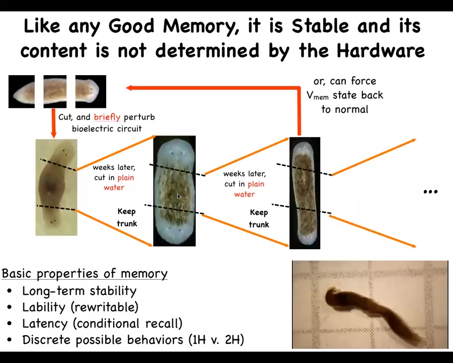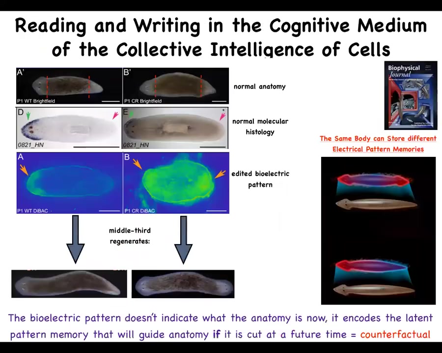 This bioelectric pattern is a map of this one-headed body, not of this one. It's even a counterfactual memory. It doesn't do anything until you cut off the head and the tail. That information is used to drive morphogenesis.