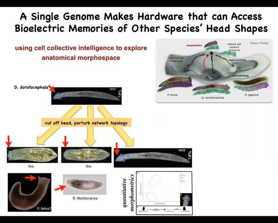 So what you see is that the exact same hardware can visit attractors in this anatomical morphospace that normally belongs to other species. Normally, this other genetically specified hardware is what lives there, but you can prompt this group of cells to visit them as well if the appropriate information is there in the physiological control circuits. So head shape, head number, you can go well beyond that.