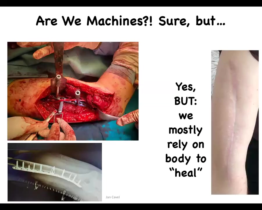 This is an example of a surgery where you can see whether living things are machines or not. There are a number of approaches. This is a very machine-like approach. Here's what it ends up being, the surgery, there's an integration of living material and a very low-agency passive material, which all it does is hold its shape. But this is not the only game in town as far as manipulating living matter, because after we do this, we rely on the body to, quote unquote, heal. All of the things that happen after this are things that we don't have much control over. In molecular medicine, the only successful interventions, permanent interventions, are things that work against the low-agency invaders of the body, such as microbes, cancer. Antibiotics, chemotherapy, those things work well.