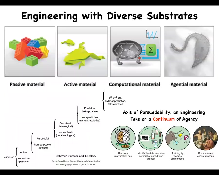 Bodies are all the way to the right of this continuum; I call it an axis of persuadability as far as different types of technologies that you need to optimally relate to these different systems. Even molecular networks have six different kinds of learning that they can do. All up and down this scale of different levels of sophistication by Wiener et al., we start to find different ways to relate to these systems to try to change their function.