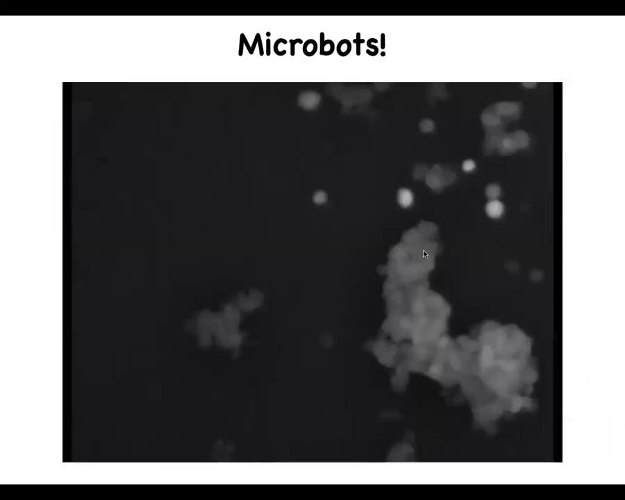 And if you provide them with cells, it turns out that what happens is that they implement von Neumann's dream of a robot that goes around and builds copies of itself from materials it finds in the environment. So these white flecks here are individual cells. What the bots do is they run around and they collect the material into little piles. They both collectively and individually shape the cells into smooth little piles.