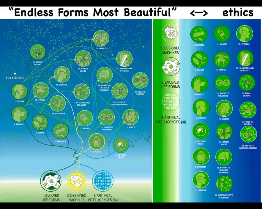I also think that when Darwin had this famous phrase, "endless forms, most beautiful," he was really impressed at the wide variety of living forms that he saw. Everything that he saw, that end of one example of the tree of life on Earth, is a tiny corner of this massive option space of possible beings, possible bodies, and possible minds. Because biology is so highly interoperable, because biological systems will find a coherent way to exist even when mixed at every level with foreign DNA and nanomaterials. And so every combination of evolved material, designed material, and software is some kind of plausible agent. So we have cyborgs and hybrids and chimeras. Many of these already exist. They will increasingly exist. And this has huge implications for ethics because the old way of figuring out how you're going to relate to something, which is where did it come from, meaning was it evolved or designed? And what does it look like? What's inside? Is it a human brain? Is it soft and squishy? Is it made of metal? Those kinds of criteria are basic, they were never any good really, but they served okay in prior ages. They're not going to survive the next couple of decades. It's a completely different game looking into the future where we're going to have to find ways to relate to beings that are nowhere on the tree of life relative to us and that are completely different in terms of their provenance and their structure and behavior. And so we're going to have to figure out a way to relate to them.