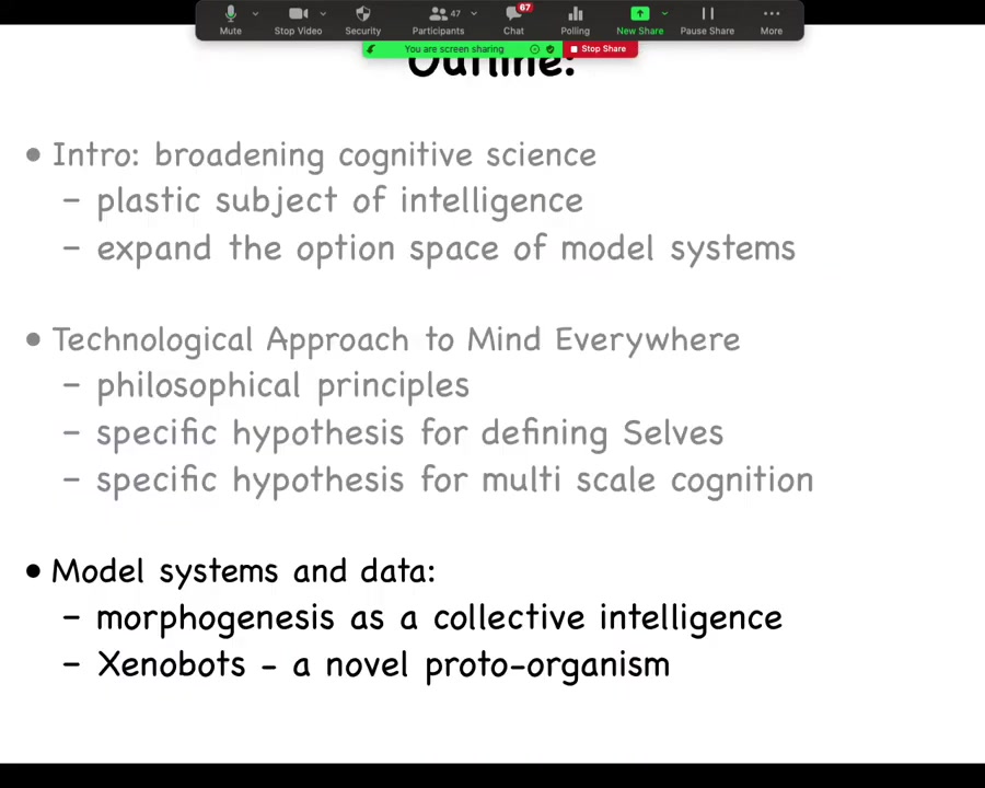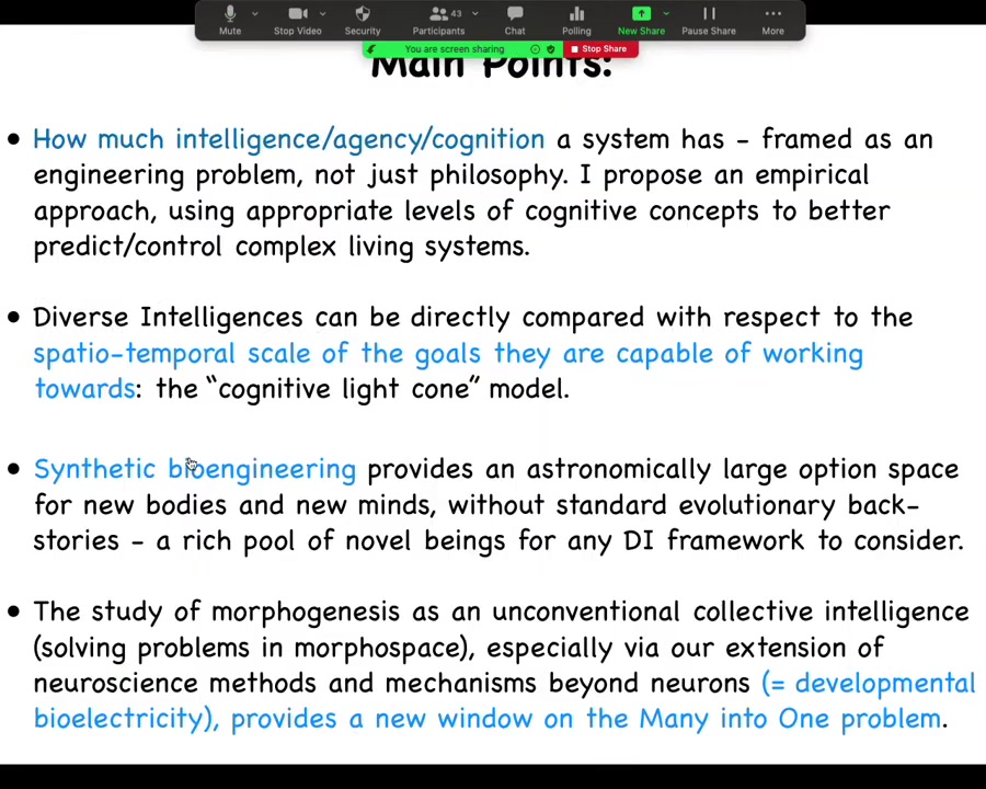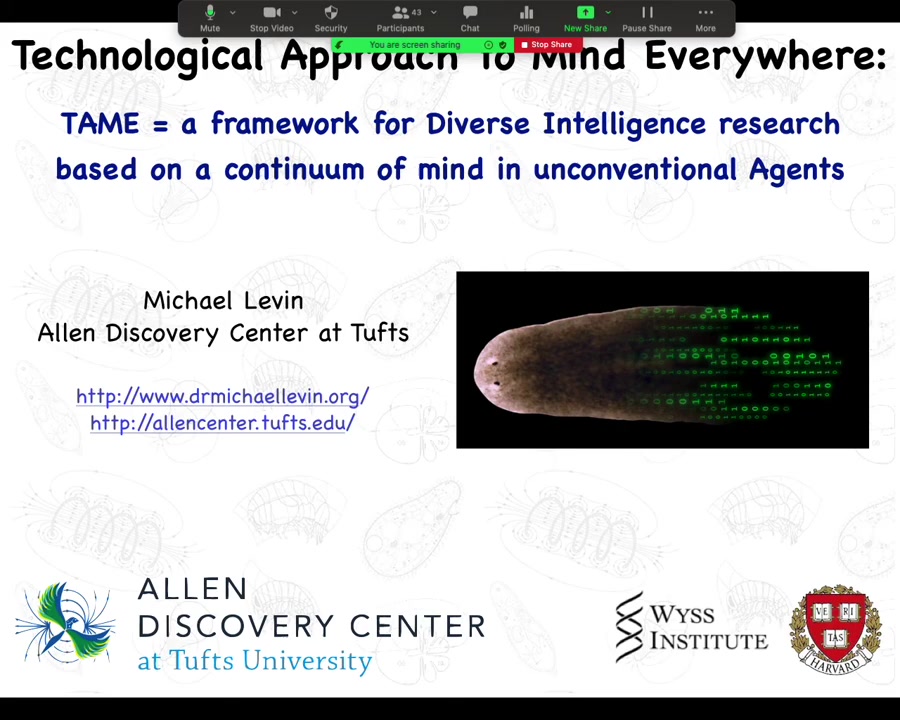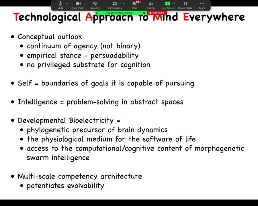 I'll also show you some data on the study of morphogenesis as an example of an unconventional collective intelligence. As I talk about all these unusual types of cognitive agents, I'll show you one particular example which solves problems in morphospace. I'm going to argue that developmental bioelectricity and the study of how morphogenesis is a kind of collective intelligence bound together by electrical dynamics provides a new and interesting window on this problem of binding lots of competent subunits into one greater unit.