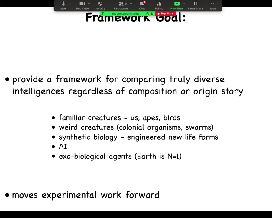 The goal of my framework is this. What I would like to do is to enable comparing truly diverse intelligences. This means not only the things that we're all used to, complex animals, apes and birds, but also weird creatures such as colonial organisms and swarms, but also synthetic biology and its products, so engineered novel life forms, software agents that arise out of artificial intelligence work, and possibly any exobiological agents, because the Earth's biosphere is, of course, an example of N = 1. If we find something else, we ought to be able to deal with it. This is what I would like to do, is to have a framework that applies to any of these things, and also that helps move experimental work forward. I'm going to talk about this in three pieces. First, the introduction where I want to broaden a little bit the way we think about the subjects of cognition. I'm going to talk about how the subject of intelligence and cognition is really plastic. Then we'll talk about this framework, which we call the Technological Approach to Mind Everywhere or TAME. Then we'll talk about some data that shows how this thing works.