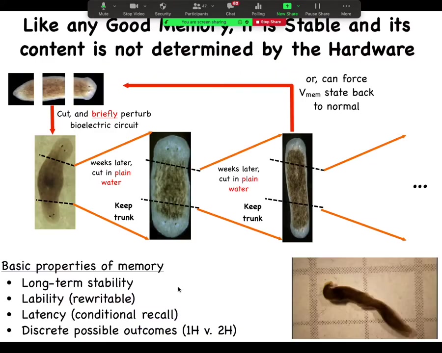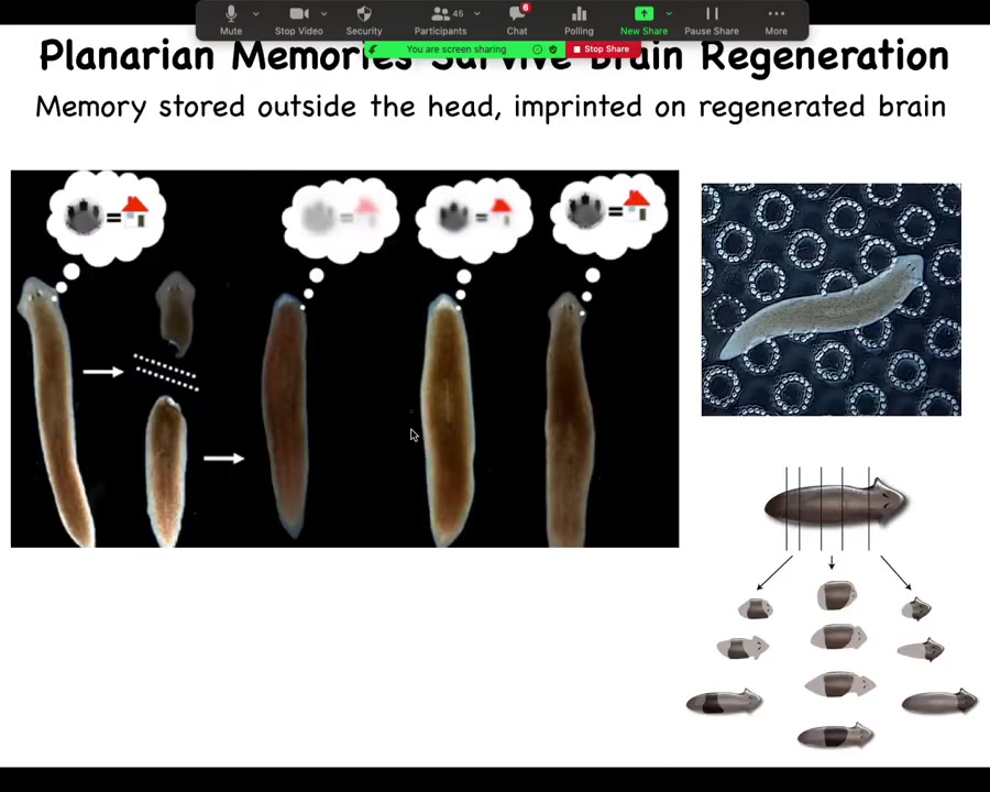 This, we can put that even on steroids by looking at planaria. So these are flatworms. And these flatworms are relatively smart. They can learn and they have all kinds of interesting behaviors. And one of the things about planaria is that you can cut them into pieces and every piece gives rise to a whole new worm. So they regenerate. Every piece knows how to make a whole new planarian.