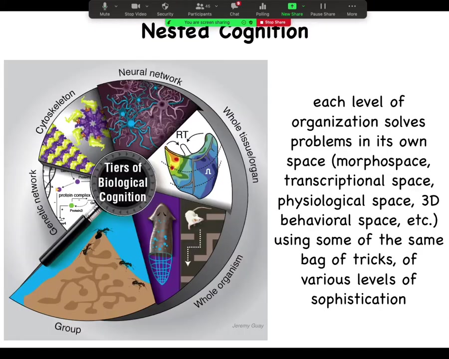 Okay, so we're really interested in this idea that agents, all cognitive agents are collective intelligences. So all of us are made of parts. There's no such thing as a indivisible monadic intelligence. I'm not even sure what it would mean to be able to learn if you didn't have parts that could change. But because we're all made of parts, we have to potentially think about how those parts relate to each other and what other intelligences might be in any given system. So we study all the way from learning capacities in protein pathways and gene regulatory networks to the computational capacities of the cytoskeleton, of neural networks, of tissues and organs, whole organisms and swarms. All of these tiers of biological organization are simultaneously solving problems in various spaces, and we'll get to that momentarily. The interesting thing is that not only do we have to look at an agent and say, what are the parts doing and how are the parts able to rearrange, but in fact, we can now replace all of these parts.