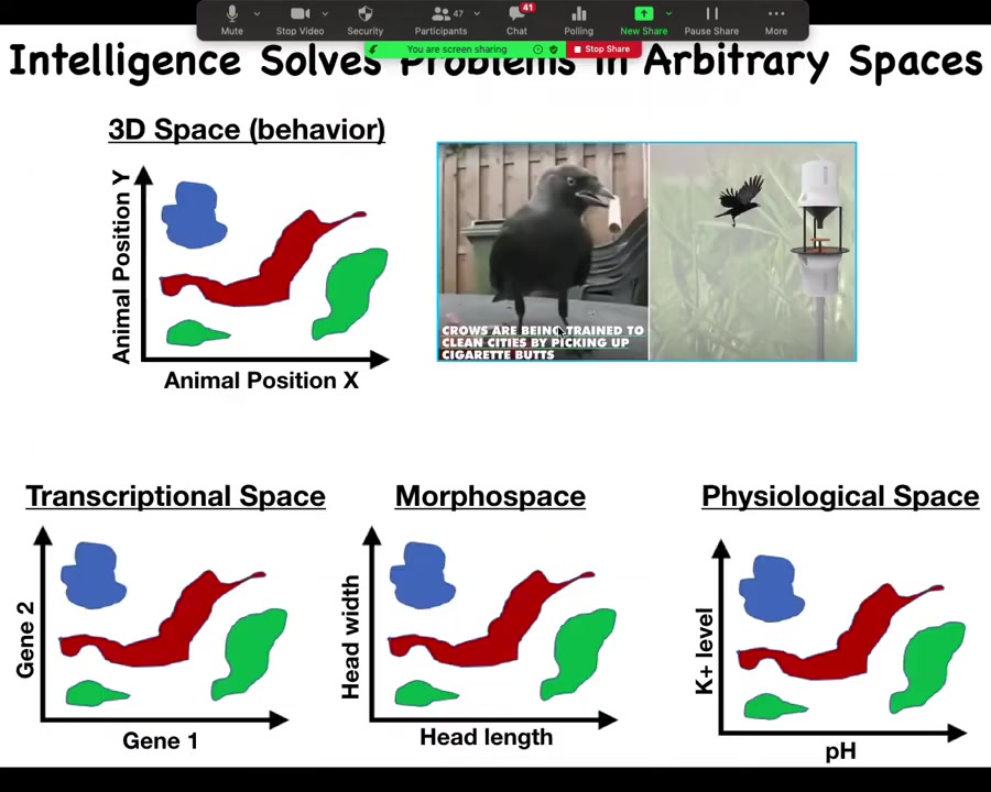 But all kinds of systems, cells, tissues, organs and so on, solve problems in other spaces. In transcriptional space, the space of all possible gene expression patterns, you have to navigate that space and be able to turn on exactly the right genes to be in the state that you want. Morphospace, about which we'll talk more in a minute, is the space of anatomical structure and deformation of the body, and physiological space. As things happen and physiological parameters are impacted, how do you navigate that space to keep within homeostasis?