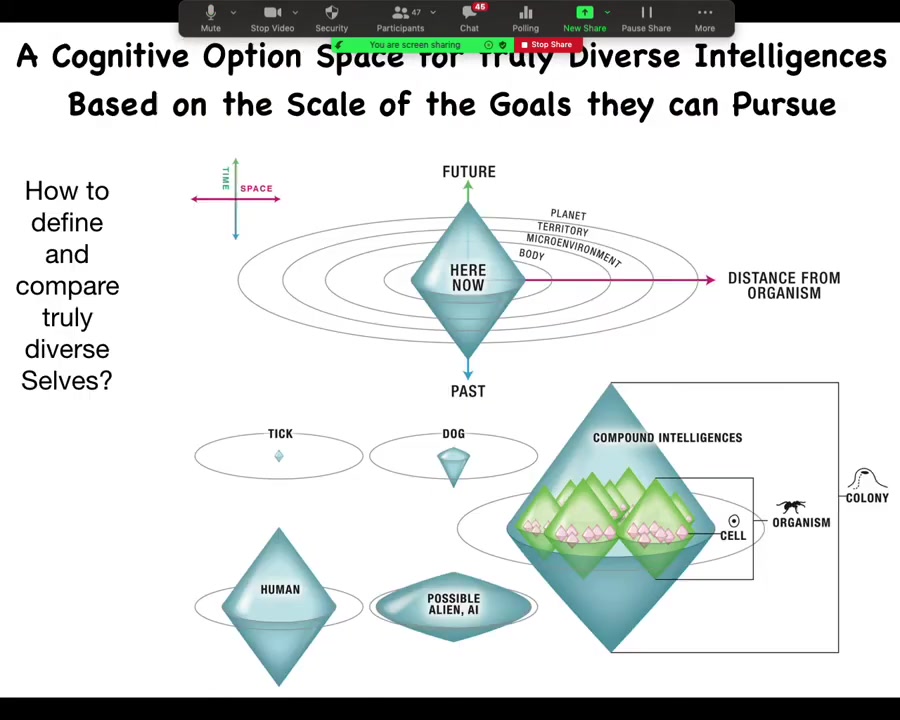 I think diverse intelligences, truly diverse intelligences, can be directly compared with each other with respect to a particular component, which is the spatial-temporal scale of the goals that they're capable of working towards, and I'm going to try out the cognitive light cone model, and I'll explain how that works.