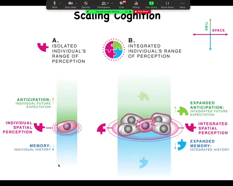 I am curious about your light cone graphic, which to me occludes the internal horizon or the resolution or granularity of the awareness that these systems have about themselves. It looks like data viz for integrated information theory. Again, not a hard problem question, but more a question about, in SFI language, the way that my awareness of my own body is the aggregate or collective awareness. I'm thinking of Jessica Flack's work on collective competition, and I like that you don't privilege any particular viewpoint here. Where you stand on this line of thinking, as it reflects on a society's ability to be aware of itself, or my own ability to be aware of what's going on inside me at a cellular level?