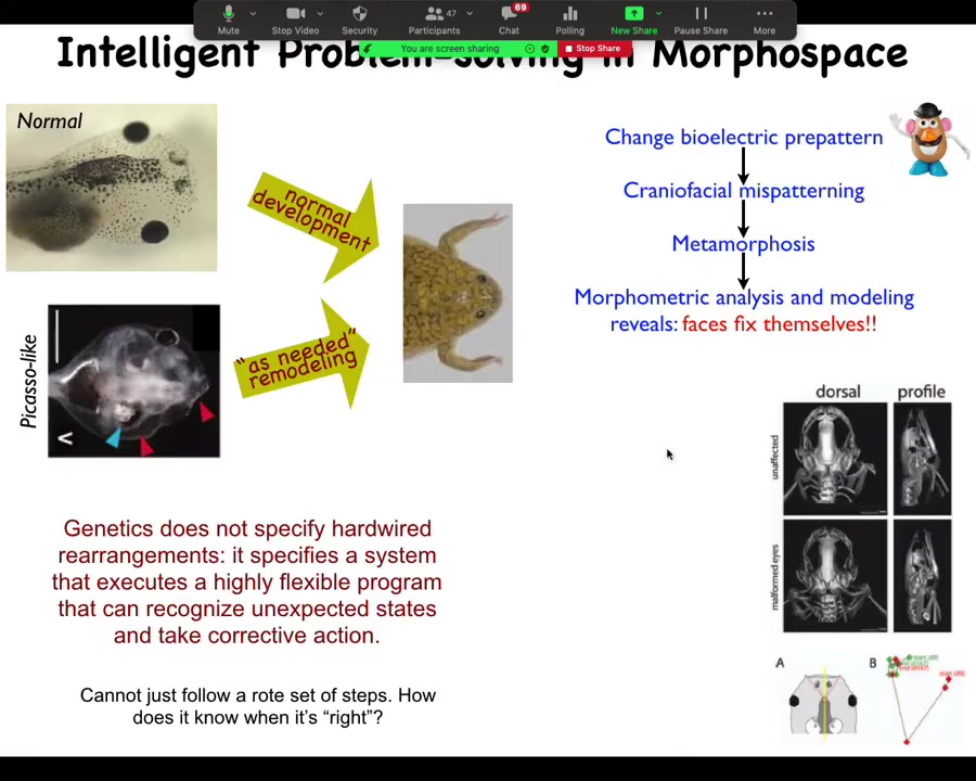 This shows a model system in which we go from ideas about what's really the nature of goal-directed intelligence in morphospace, making a healthy tissue instead of crawling around randomly as an amoeba, and how we can manipulate that in a very predictive way.
