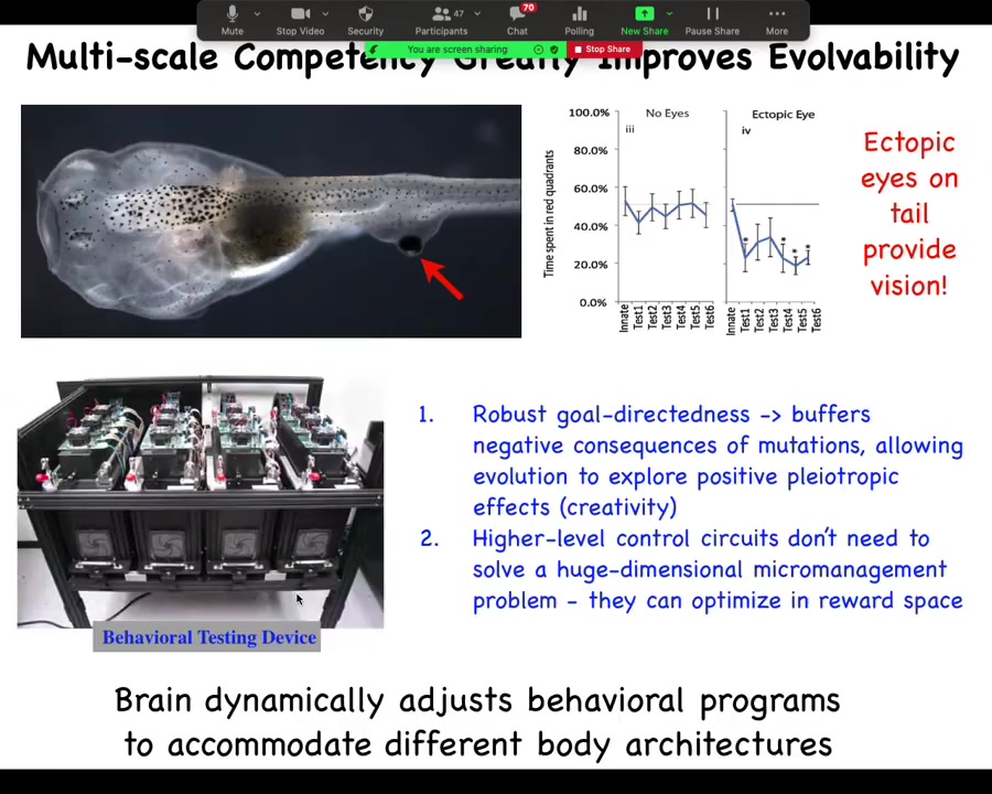The amazing thing about all of that is the implications for evolution. Here we have a tadpole. You will notice that this tadpole has no eyes where the eyes normally are supposed to go, but we've given it an eye on its tail. These tadpoles can see perfectly well. You can use this machine to train the tadpoles on visual learning tasks. They learn quite nicely. What this suggests is that these eyes don't connect up to the brain. They connect often to the spinal cord. Completely novel architecture. Behaviorally, they still do what they're supposed to do.