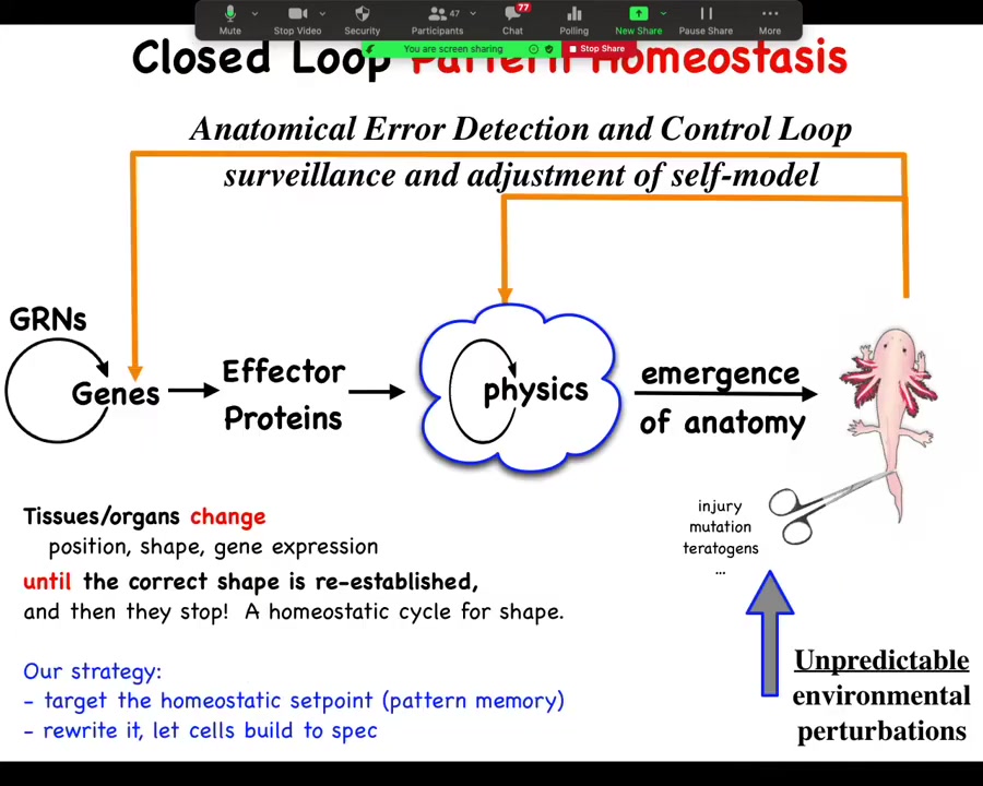 We study these feedback loops that, when the system is deviated from its goal, either morphological or physiological, by mutation, by injury, teratogens, whatever, there are these feedback loops that come back and try to get it back to the space where it needs to be. One of the key things we want to know is, where is the set point? How does it know what the correct pattern is? Every homeostatic system has a set point somewhere. The brain is a great example of this.