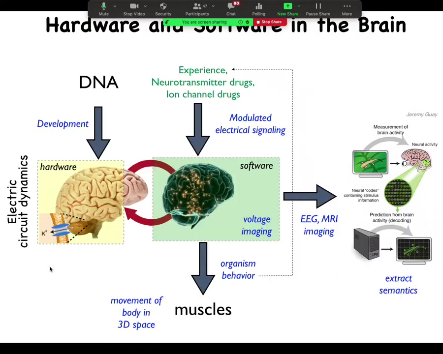 We asked, how does the brain do this? We know there's this interesting hardware system that is using an electrical network to run software. What the software does is it activates the muscles to move you through three-dimensional space. You can try to read this out, and people do this with neural decoding.
