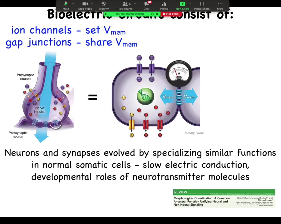 So the way it works is that every cell has these ion channels; they set voltages. These voltages can be communicated to the neighbors through these gap junctions, these electrical synapses that can open and close. Both of these things can be voltage sensitive themselves, which means that it's a feedback loop. So that means it's a transistor. It's a voltage-gated current conductance. So that means that you can now make feedback loops, logic circuits, all of that. Evolution found everything we do in our computing devices long before brains, somewhere around the time of bacterial biofilms.