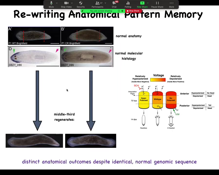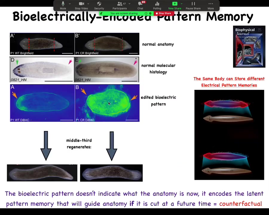 This is a system that is able to pursue goals. It is able to represent the goal that it wants to have. Notice something very important. If you think about a memory of something that's not going on right now. We're very advanced. We're able to entertain counterfactuals. This electrical pattern here is not the pattern of this animal. It's actually the pattern of this animal that we've already changed. In other words, this one-headed body can store one of two types of memories of what a correct planarian is supposed to look like. When it gets injured in the future, it uses its memory to construct the new body. This bioelectrical pattern is not a readout of the current anatomy. It is a represented counterfactual memory of what you're going to do if you get injured in the future. If you don't, you stay as one-headed.