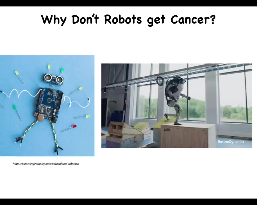 Let's ask a strange question. Why is cancer not a problem in the robotics field? What you can see here is that we have now fairly complex engineering structures, very functional, doing all sorts of interesting things. One thing that this field does not have is a problem that is similar to cancer. Why is that? What I want to point out is that, at least for now, the major type of architecture that we deal with in engineering is very flat. The large-scale system as a whole might have various problem-solving capacities, but they're made of parts without agendas. The parts themselves are not smart.
