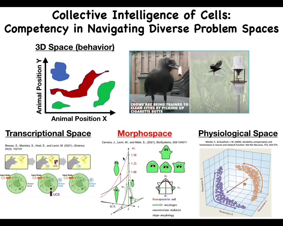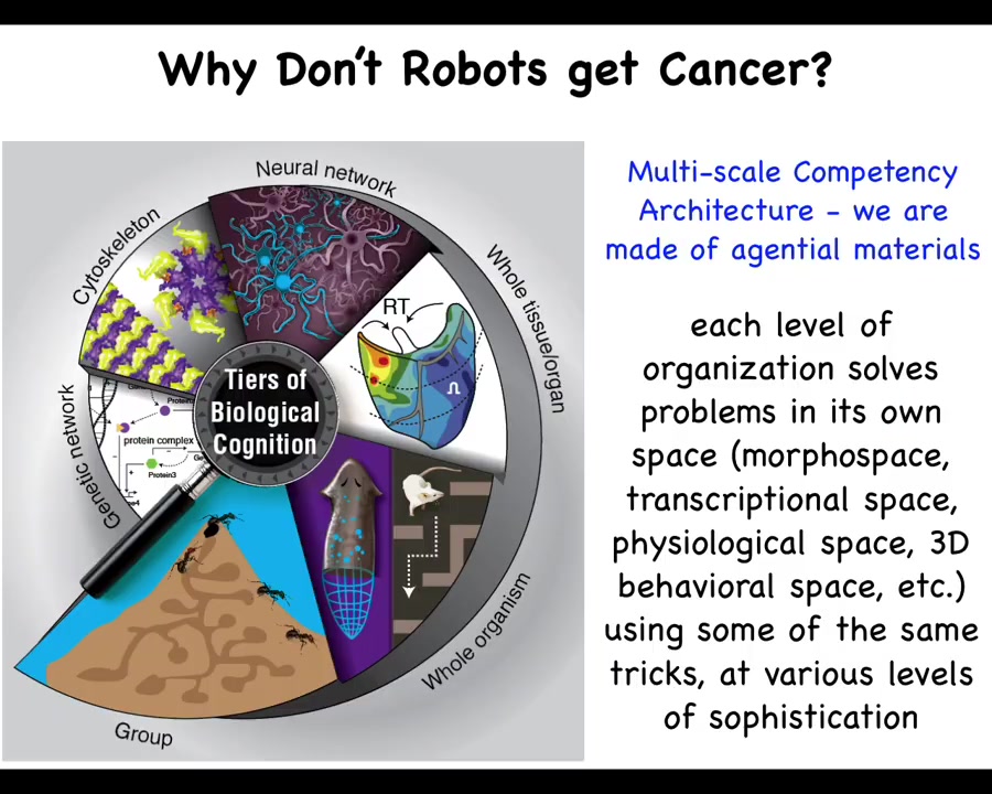 And biology is not like that at all. What we have in biology... is what I call a multi-scale competency architecture. That is, we are made of a material that all the way down from the genetic components to the subcellular organelles, tissues, organs, and all the way through groups and colonies and so on, have various competencies at every level. This is not just a structural set of nested dolls, but actually at each level, there are competencies of solving certain problems in different spaces. And this has massive implications, both for the remarkable plasticity and robustness of life, but also for certain failure modes. All of these are able to pursue specific states with various degrees of competency and ingenuity in different spaces that I will mention momentarily.