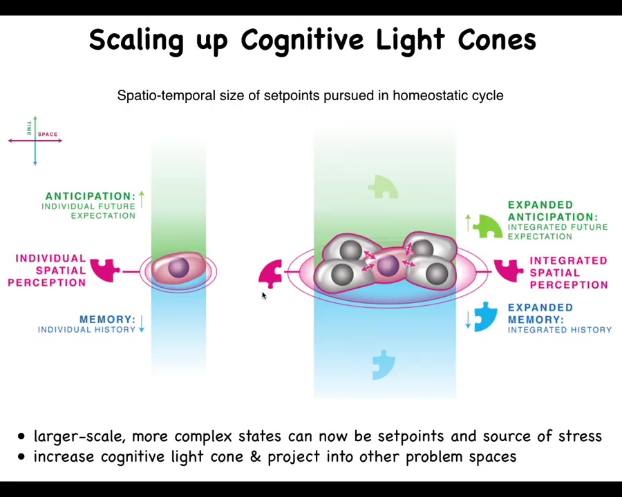 What happens in multicellularity, both during our embryogenesis and during evolution, is a radical scale-up of what we call the cognitive light cone. So the cognitive light cone is simply the size, both in space and time, of the largest set point that any system, be it cells, animals, artificial systems, can pursue in a homeostatic process. The bigger the ability of the system to have a memory going backwards in time, anticipation forwards in time, and spatial extent, the more the right connectivity between subunits allows them to expand their cognitive light cone and use much larger states as the goals they pursue in these homeostatic loops.