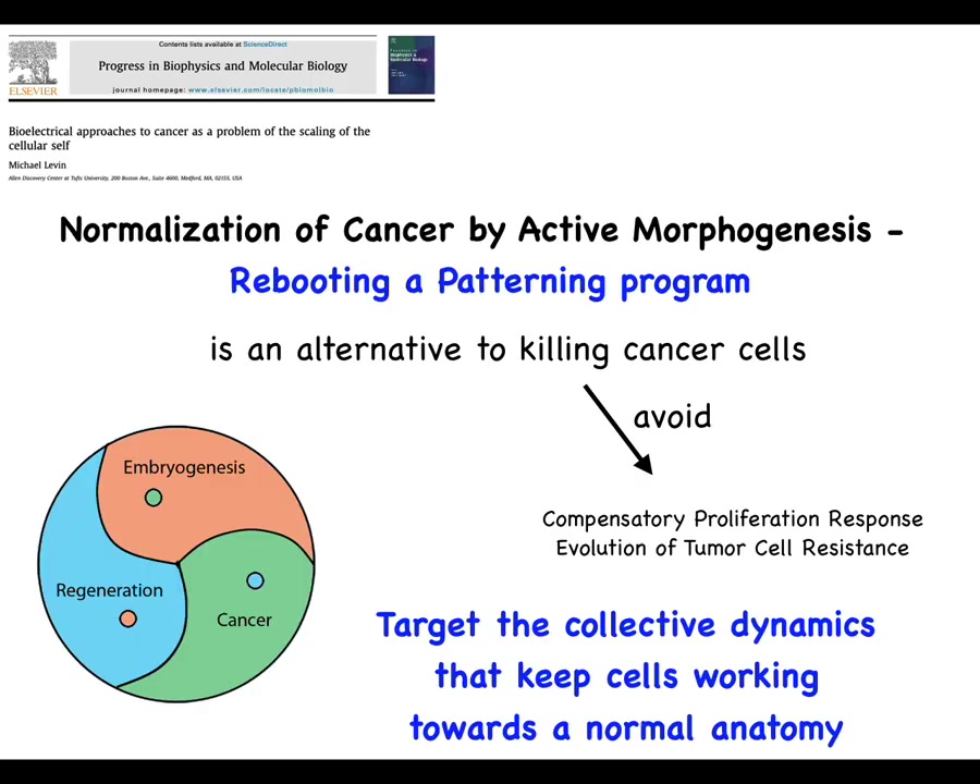 So this leads to a suggestion, which is that perhaps what we can do is normalize cancer by rebooting a patterning program, by connecting cells to the set of cues that normally keep them harnessed towards some kind of morphogenesis. This would be an alternative to necessarily killing those cells, which might allow us to avoid a compensatory proliferation response, evolution of tumor resistance, and so on. Instead of trying to kill those cells, we're going to try to reconnect them to the large-scale homeostatic set points that they used to have. So, let's see how we might do that.