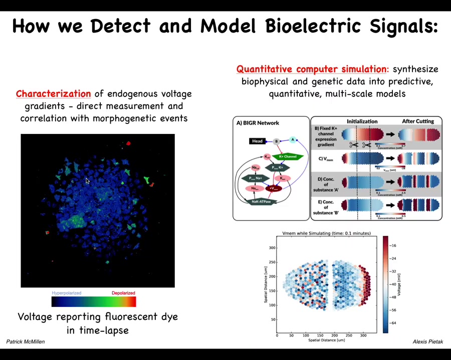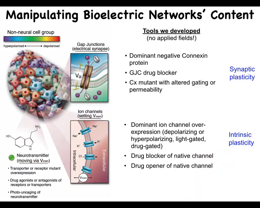 What we've developed are ways to control the bioelectrical states without having to use old tools such as electrodes. We don't use electric field application. There are no electromagnetics, no EM waves. What we are doing is targeting the native interface that the cells are already using to communicate with each other. That would be the ion channels in the membrane and the gap junctions. This allows you to change individual voltage states of cells. This can be with mutations. It can be with pharmacology to open and close these channels. It can be via optogenetics. That allows you to put down specific bioelectrical patterns.